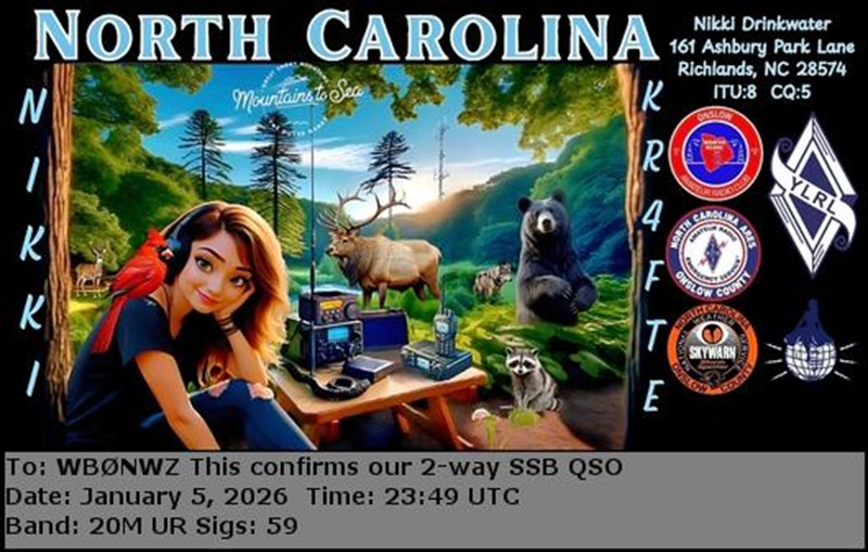 This the eQSL image. The paper card Nikki sent was scuffed by the Post Office, eliminating the poor elk in the background. While good, the quality is less than the magnificant paper version. |